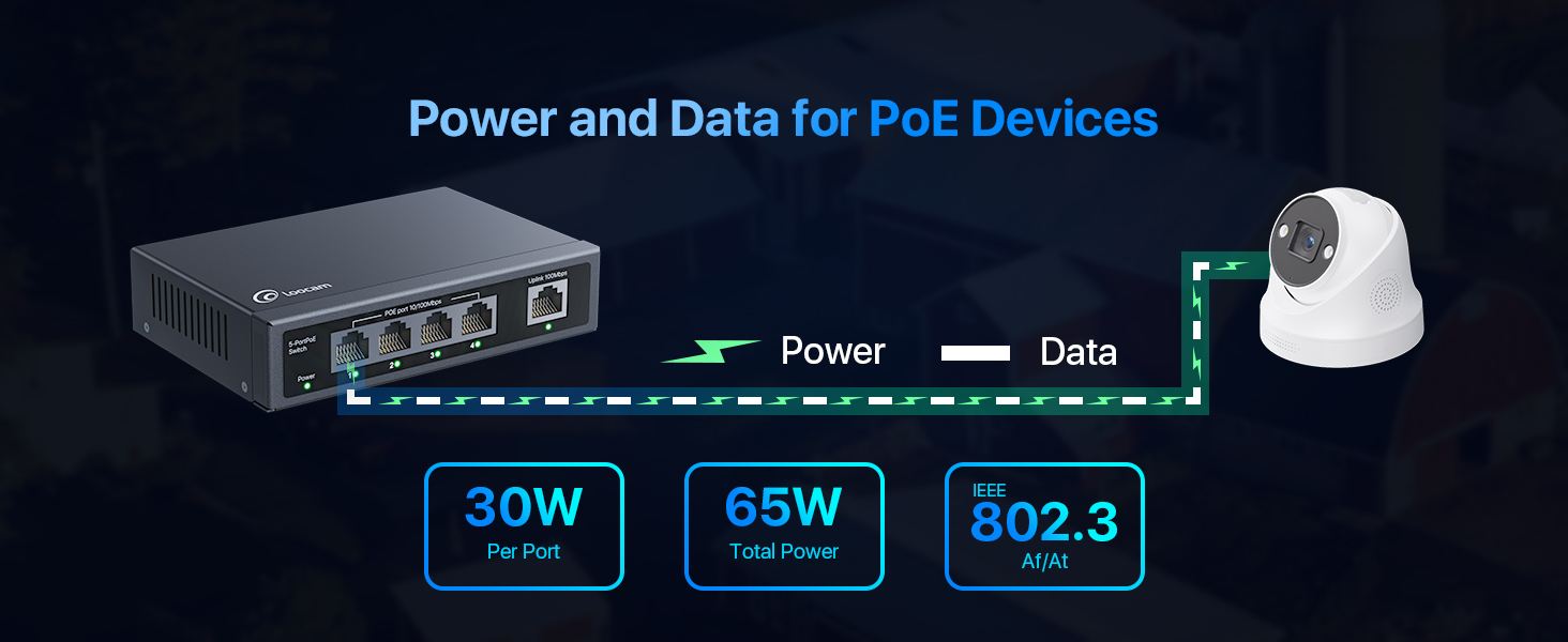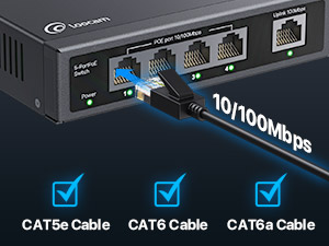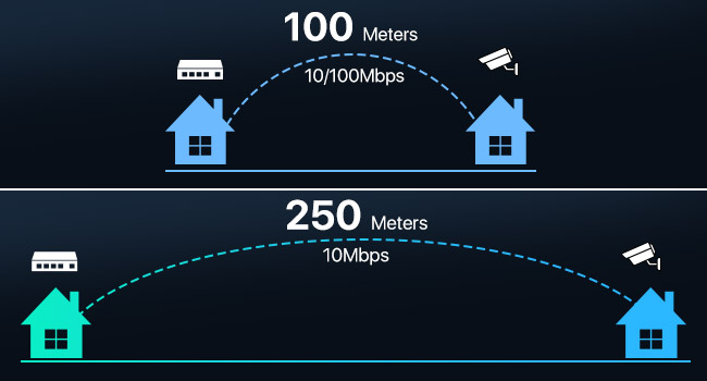 PoE switch 4 port automatically detects the transmission distance and adjusts the transmission rate, extends up to 250m(820ft) data, and powers PoE transmission range (Speed will drop to 10 Mbps). For better result over long distances transmission, use cat5e cables or above.