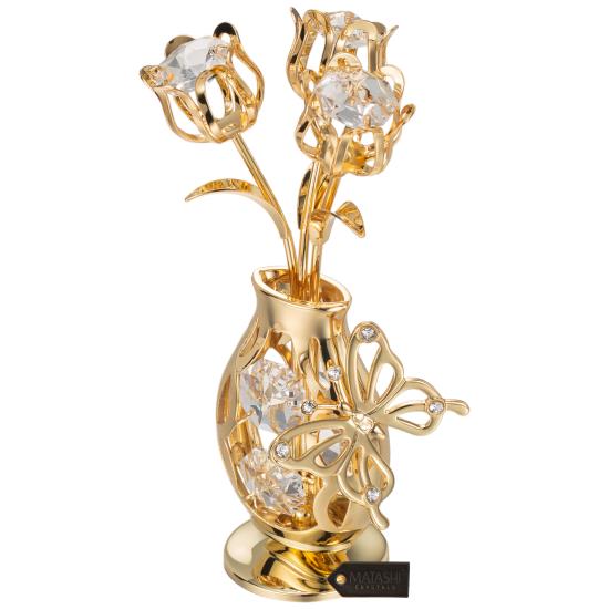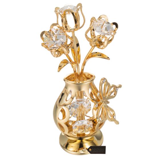 24K Gold Plated Crystal Studded Flower Ornament in a Vase with Decorative Butte