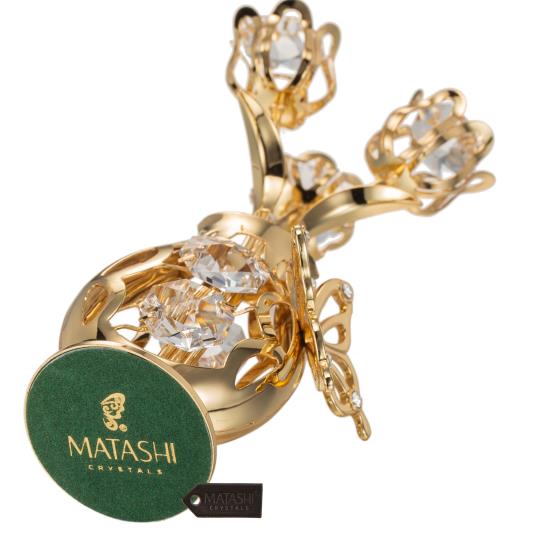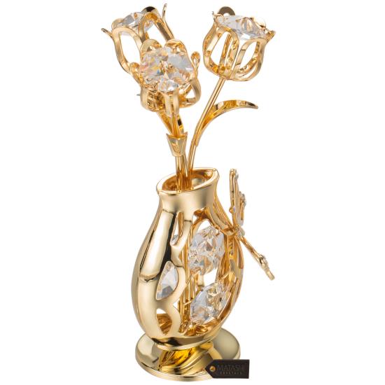 3 gold tulips reach towards the sun from within a curvy table top vase with a Butterfly figurine perched on the side.. Matashi ornaments are perfect for any occasion! Buy one for yourself, or as a gift to celebrate any occasion, from corporate gifts to holiday stocking stuffers! Crafted with quality materials like 24K Gold and decorated with authentic precision cut crystals that enhance the beautiful design. Spruce up your desk, or house with this piece!