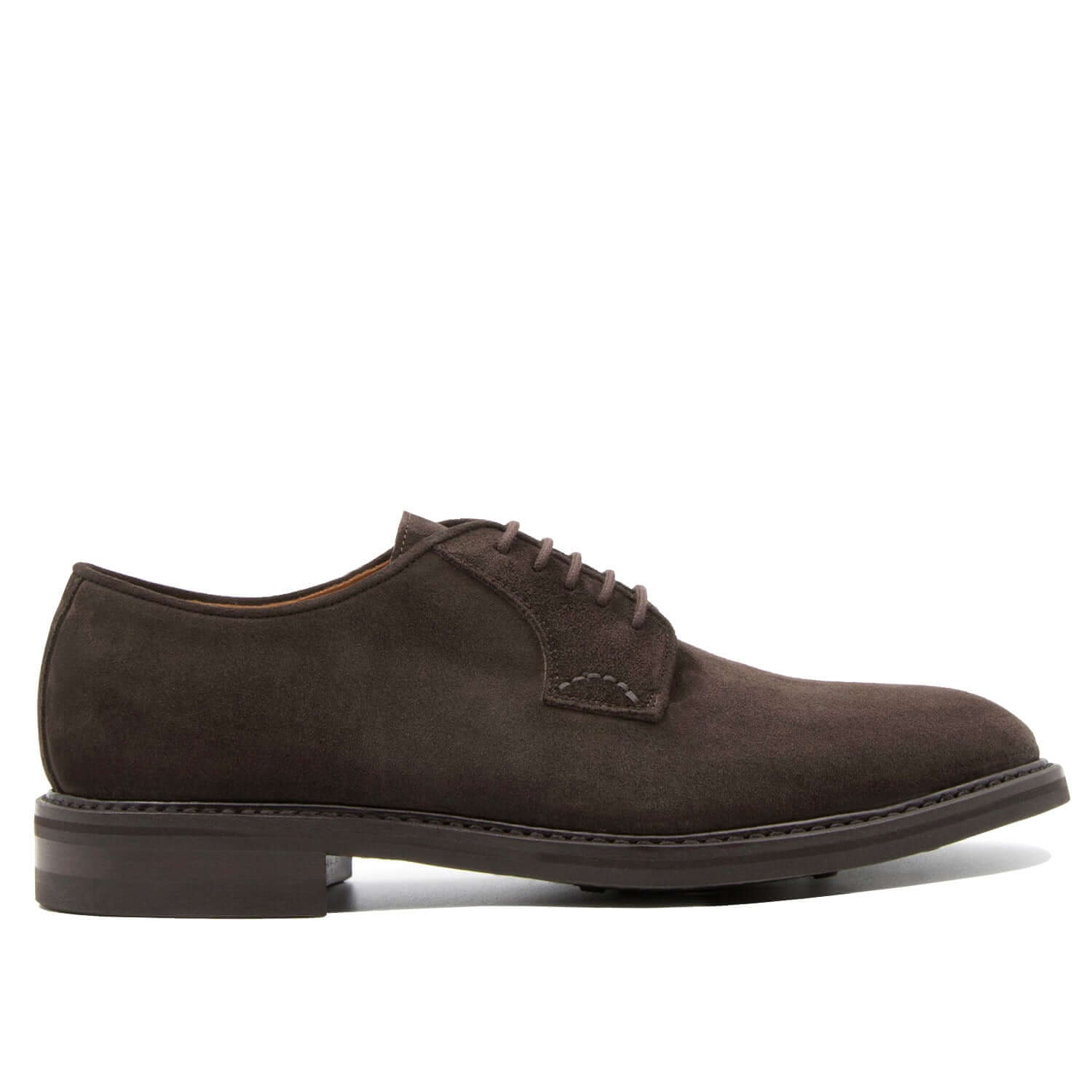 Scarpa classica da uomo stringata di colore coffee, realizzata in morbida pelle scamosciata, allacciatura a derby e suola in gomma. Calzatura classica con forma arrotondata, lavorazione Goodyear Welted artigianale, con guardolo a L che rende questa calzatura ideale anche per un outfit sportivo e casual. Made in Italy.