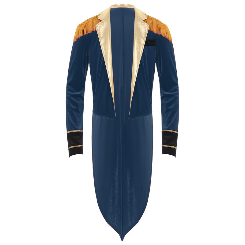 Long sleeve, lapel jacket is designed with fringed shoulder, tailcoat style.