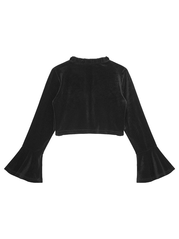 Designed with open front, ruffled trim, long sleeve and bell bottom cuffs, crop length, velvet cardigan is a perfect layer for dress.