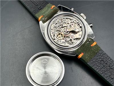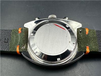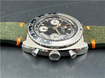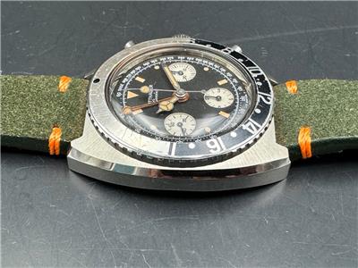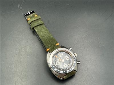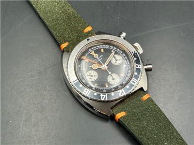 COMMENTS: VERY NICE VINTAGE WITTNAUER GMT CHRONOGRAPH WATCH WITH FAMOUS VALJOUX 72 BASE MOVEMENT. THE WATCH HAS BEEN SERVICED RECETNLY. IT FUNCTIONS PERFECTLY AND KEEPS GREAT TIME. THE STAINLESS STEEL CASE HAS BEEN POLISHED AND IN BEAUTIFUL SHAPE . THE ORIGINAL BLACK AND RED COKE INSERT IS FADE AND HAS SLIGHT MINOR SCRATCHES ON THE SURFACE. THE UNTOUCHED ORIGINAL REVERSE PANDA DIAL WITH ORIGINAL MERCEDES AND LOLIPOP HANDS ARE ARE IN EXCELLENT SHAPE AND THEY STILL RETAIN ORIGINAL LUME. THE WATCH IS FITTED WITH A BRAND NEW STRAP CO DARK GREEN LEATHER STRAP WITH A STAINLESS STEEL BUCKLE.