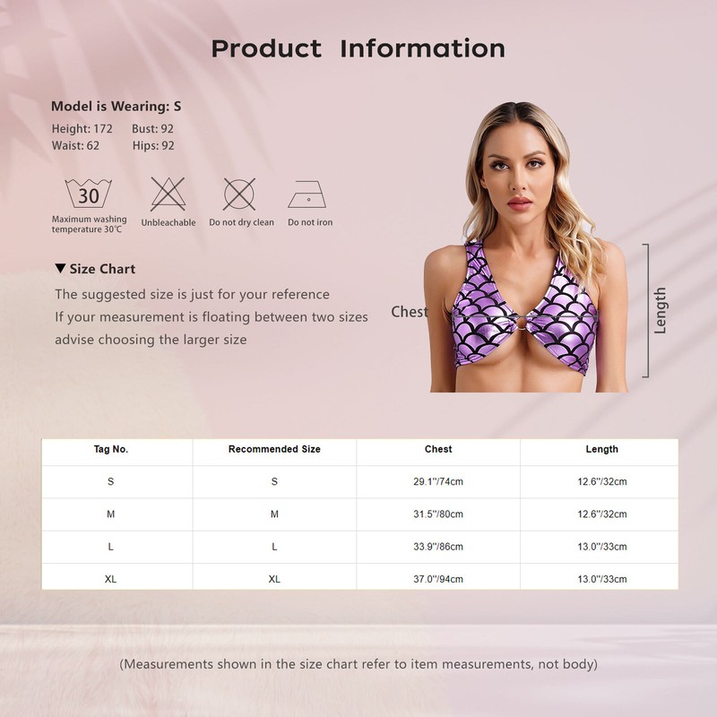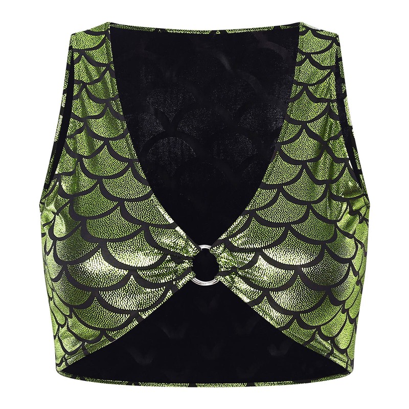 Designed with v neck, sleeveless, cutout, O-ring connected, pad-free and wireless; adopted metallic shiny fabric and fishscale print.