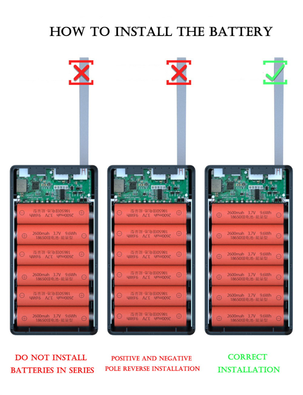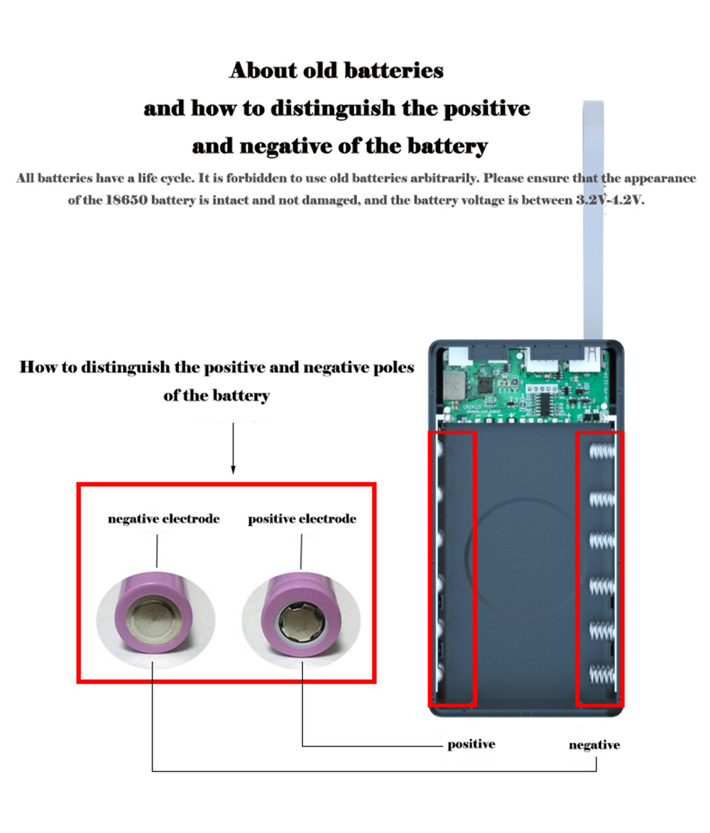 Battery should be flat 18650 battery, 65MM long, no protection plate. Pointed batteries can not be used, are large internal resistance, low capacity, small current batteries. Flashlight 18650, fire cow, fire, etc. can not be used, if you use old batteries, disassembled batteries to ensure that each voltage of at least 3.5V or more, internal resistance of 80 or less, in order to achieve normal output; voltage lower than 2.75V, internal resistance of more than 80 batteries have been damaged, put it in the battery is not charged.