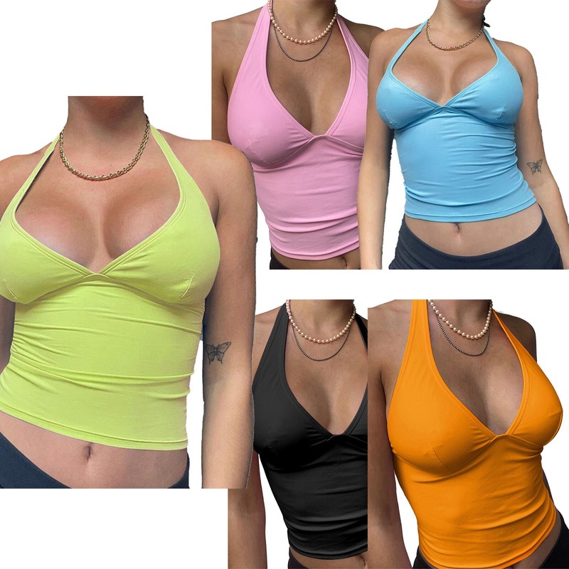 Wire-free support, plunge V-neckline, with adjustable elastic shoulder straps.