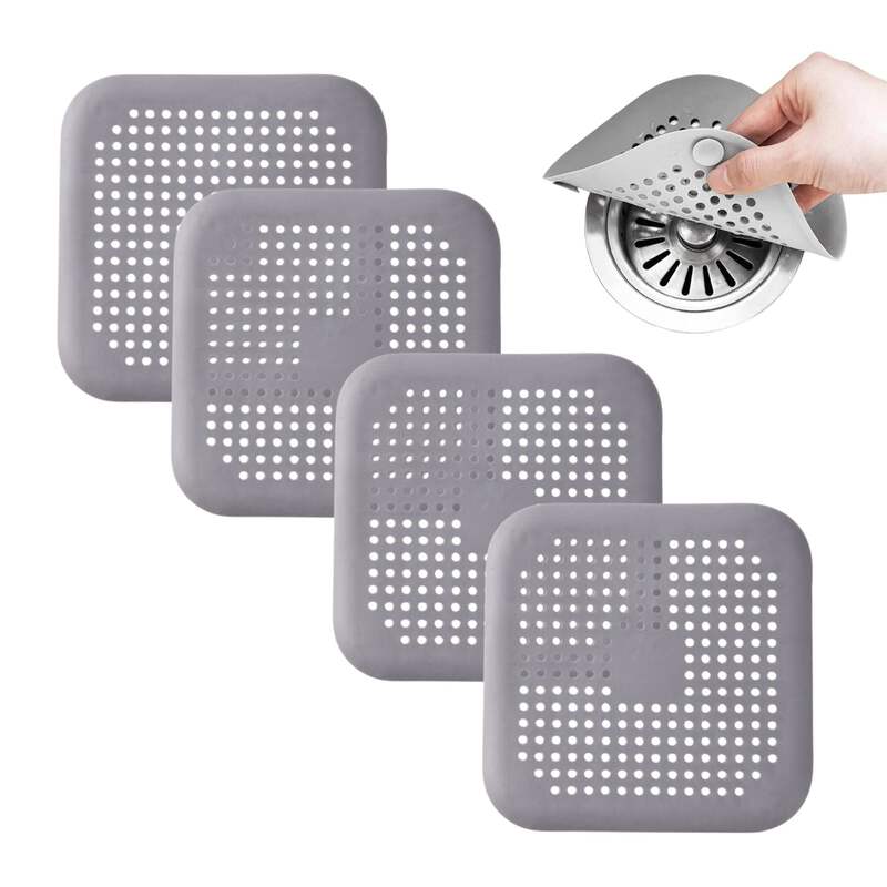 Prevent clogs and backups with this silicone drain catcher. Designed with a square 5.4-inch shape and four secure suction cups, it fits most sinks and shower drains.