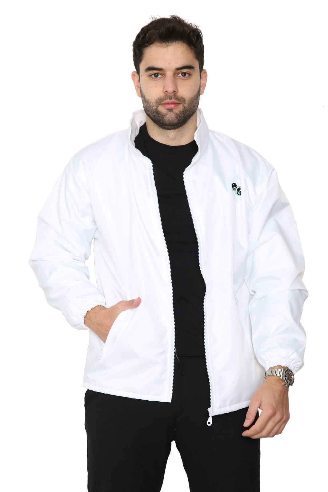 - White waterproof hooded jacket with fleece lining and full zip up, pockets and detachable hood.