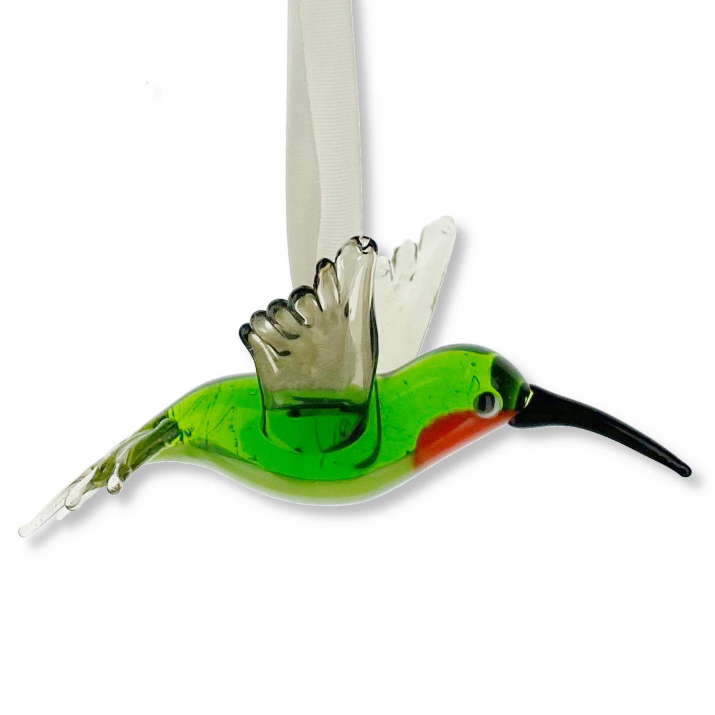 This Green Hummingbird ornament is created over an open flame, which gives it a unique detailing and luminous shine. The dark and light green body of the Hummingbird is accented with white and black spots on its belly and a red neck creating a striking contrast that is sure to catch the eye of anyone who sees it.