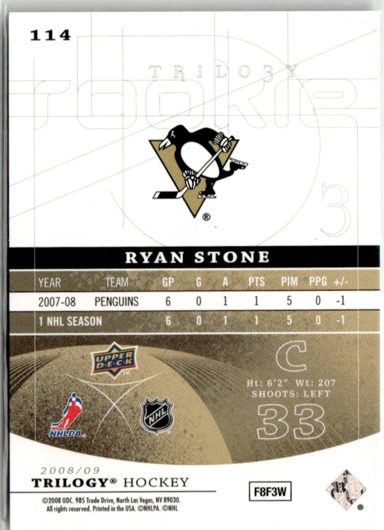 | 2008-09 Upper Deck Trilogy Rookies Ryan Stone Rookie 161/999 Pittsburgh Penguins |