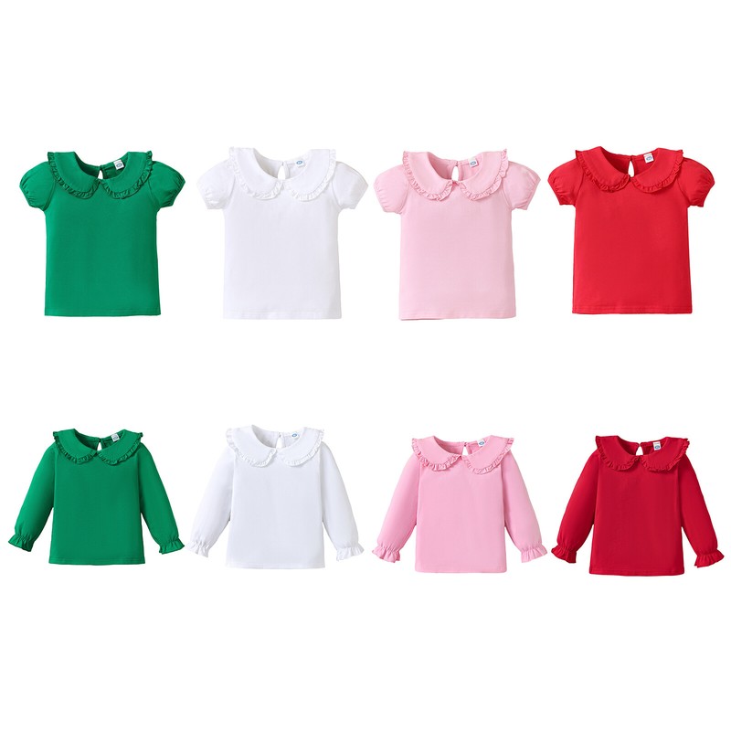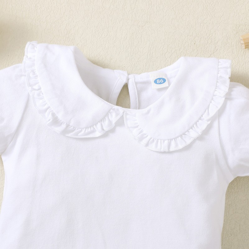 Designed with ruffle collar, keyhole back with button closure, basic T-shirt top for girl.