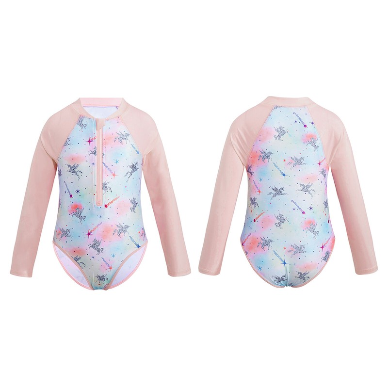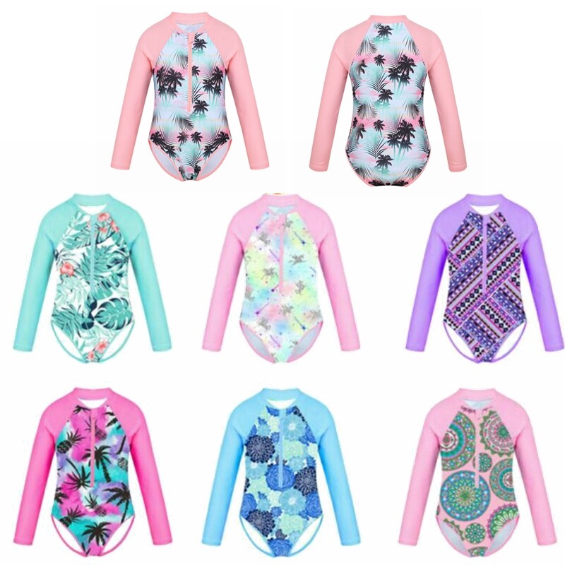 Long sleeves, swimsuit is printed with palm trees patterns. Front zipper closure for easy dressing. Zipper flap for protection.