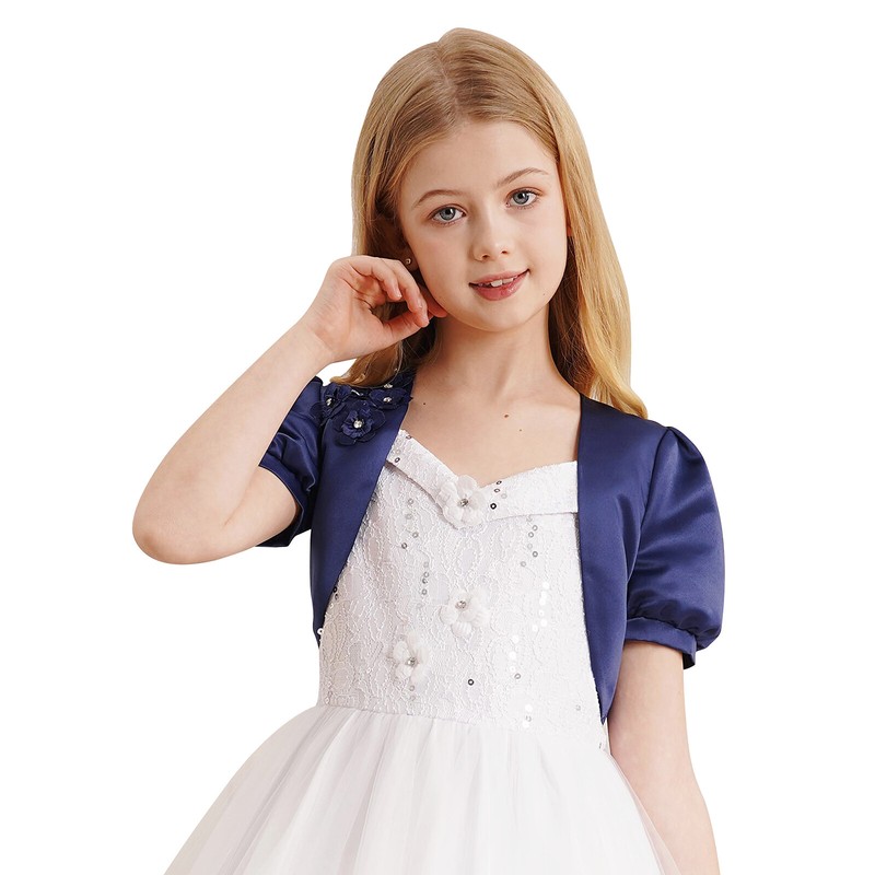 Solid color cardigan designs with curved open front, exquisite applique with rhinestone adorned in the middle, short puff sleeves and smooth lining.