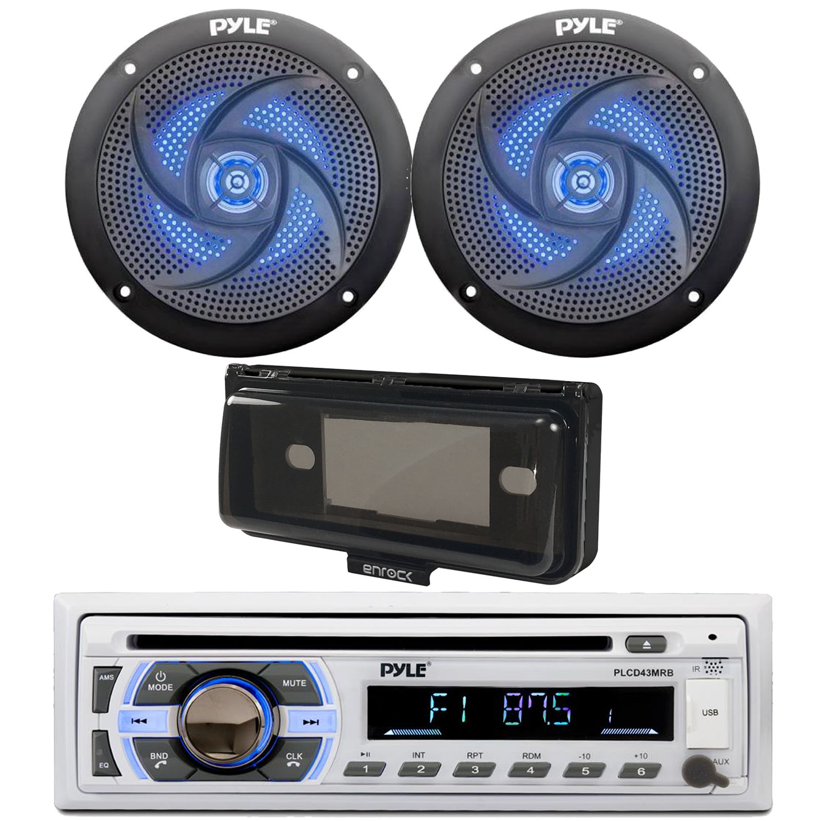 Pyle Marine CD Radio, 2x 5.25" 180W Blue Flash LED Boat Speaker, Cover (Black)