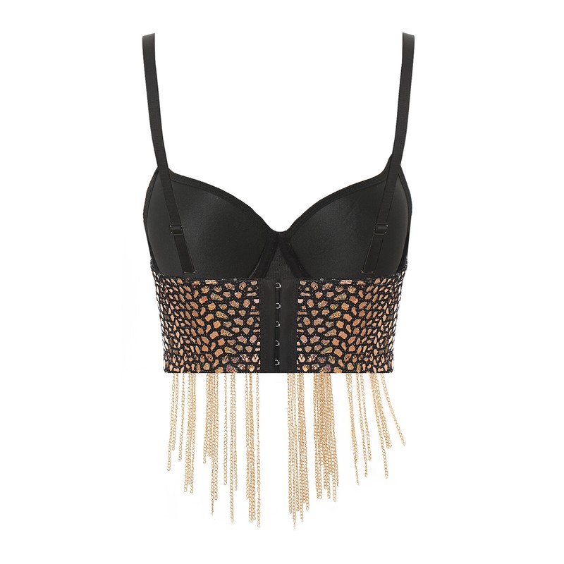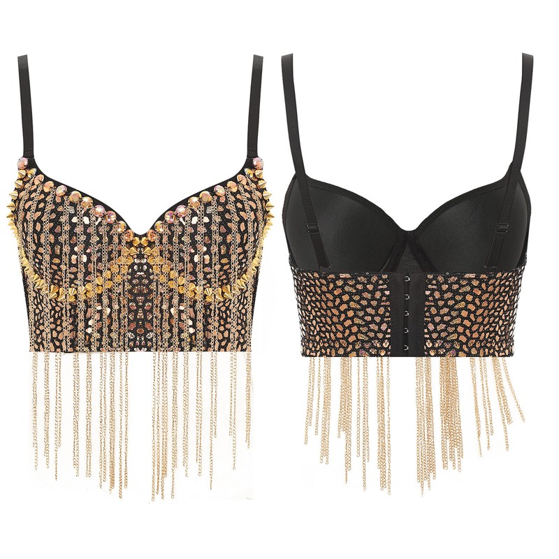 Allover shiny sequins bring dreamy and dazzling look, echoing with the chain tassel, spikes and rhinestones decorations, you are superbly sexy.