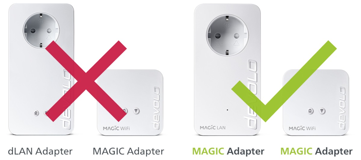 dLAN Powerline-Adapter und andere HomePlug AV-Produkte können aufgrund des unterschiedlichen Standards leider nicht mit Magic-Adaptern verbunden werden.