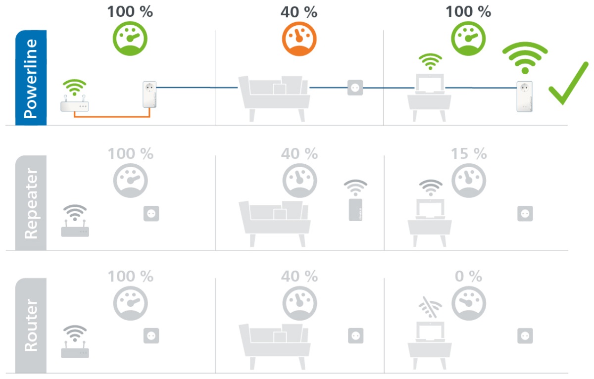 Um unsere Powerline-Produkte zu nutzen, benötigen Sie nur einen Internetanschluss sowie eine übliche Steckdose. Von Ihrem Internet-Router wird das Internetsignal über die Stromleitung in jeden beliebigen Raum verteilt und per LAN oder WLAN an Ihre netzwerkfähigen Endgeräte übertragen.