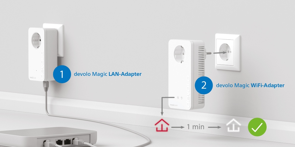 2. Stecken Sie danach den devolo Magic WiFi-Adapter in eine freie Wandsteckdose. Während der Verschlüsselungsvorgang stattfindet, blinken die LEDs beider Adapter weiß. Der Vorgang ist abgeschlossen, sobald die LEDs permanent weiß leuchten.