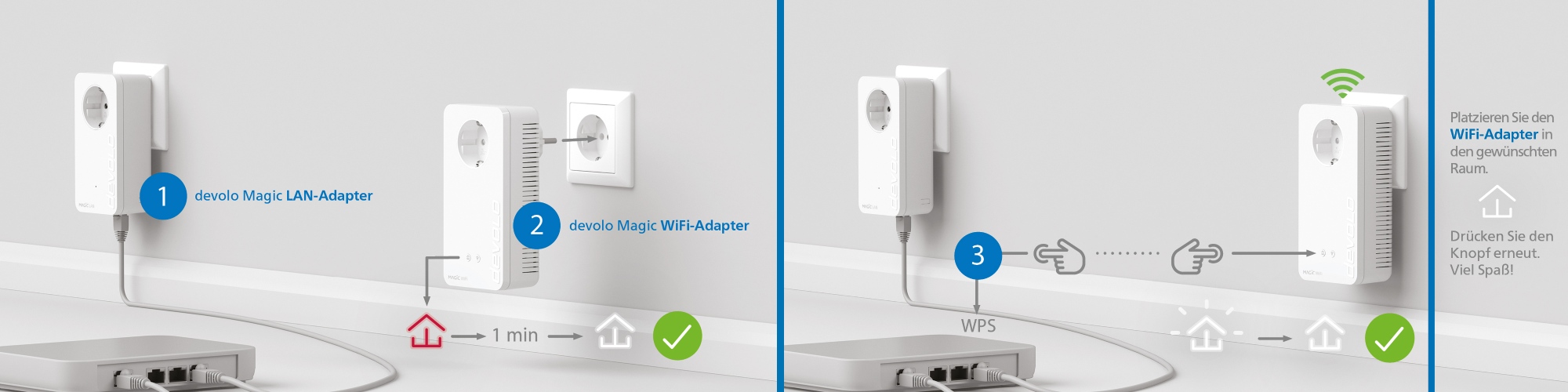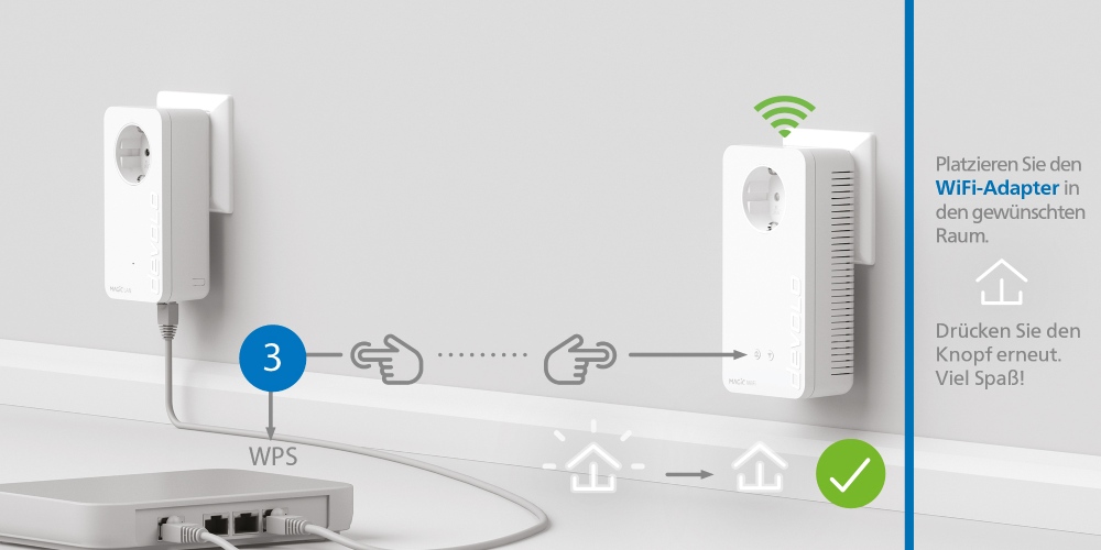 3. Um die WLAN-Daten des Routers an den devolo Magic WiFi-Adapter zu übertragen, drücken Sie kurz den Haus-Knopf an Ihrem Magic-Powerline-Adapter. Drücken Sie anschließend innerhalb von 2 Minuten die WPS-Taste Ihres Routers. Wenn die LED des Powerline-Adapters permanent weiß leuchtet, ist der Vorgang erfolgreich abgeschlossen.