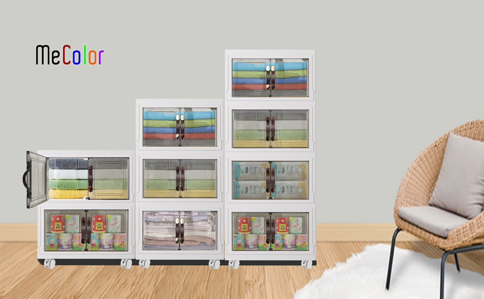 These storage bins have multiple specifications to meet your storage needs. If you are looking for simple, not too bulky, plastic containers with doors, this storage container will be a choice. They are easy to assemble, can be stacked, also can be fold up. with wheels and magnetic doors . Another advantagous for this container is that it with big capacity. so can be used in bedroom, living room, bathroom, laundry room, study room and kitchen,etc.