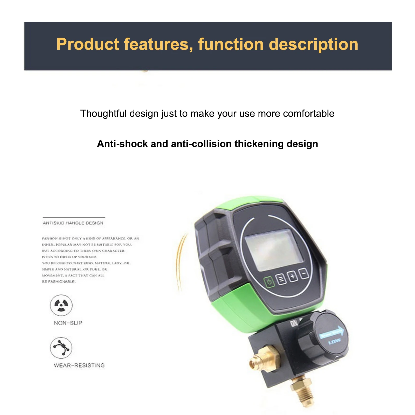 2.Test Range:0KPa~6000KPa. Digital readout, with automatic multi-unit pressure conversion, automatic conversion of temperature Celsius / Fahrenheit to facilitate different needs. The carried refrigerant pipe can be bent at multiple angles to make your operation easier.