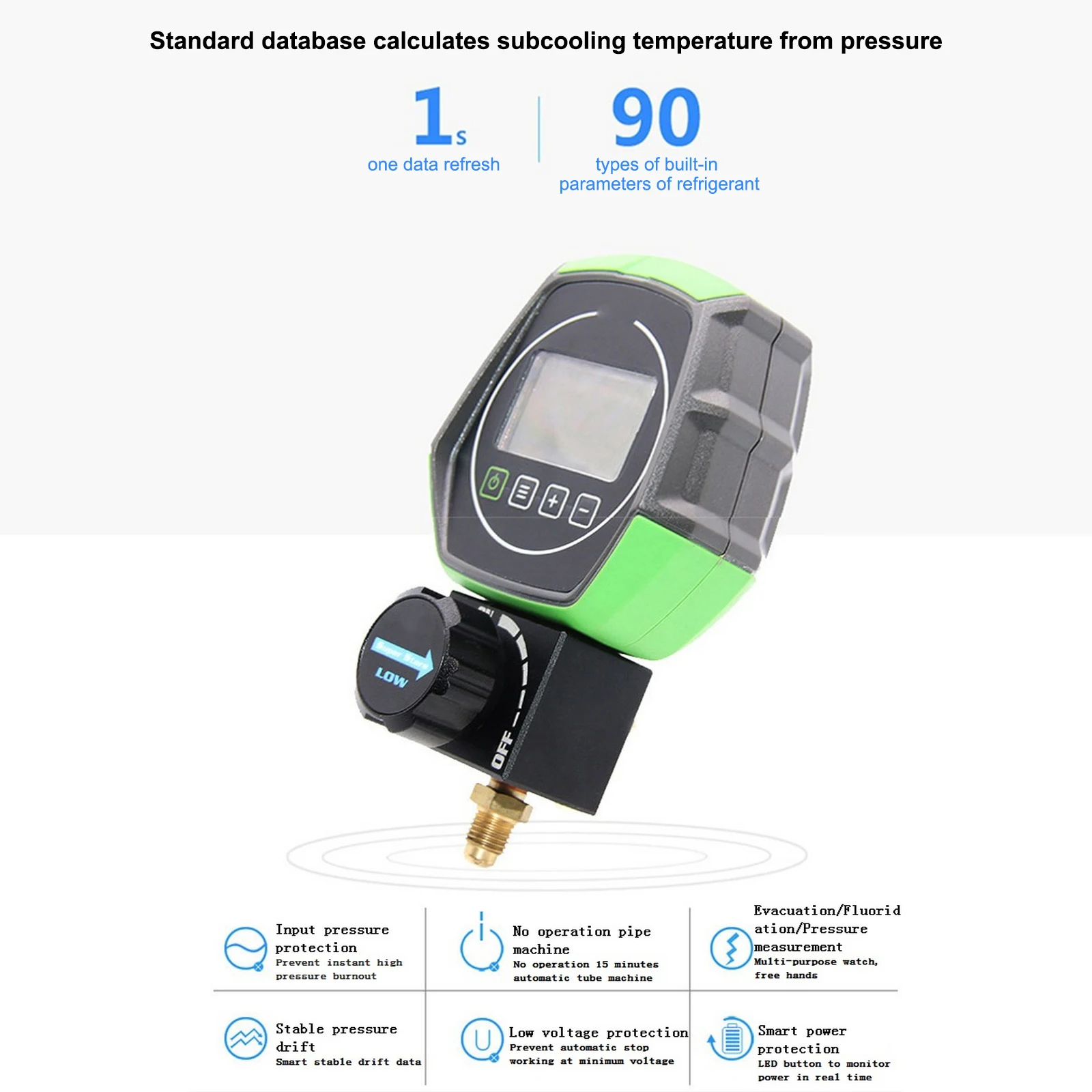 Digital refrigerant gauge adopts the most advanced digital circuit and the high precision pressure sensor, used for both high accuracy refrigerant pressure and vacuum pressure, 90 refrigerants build-in according to standard refrigerants pressure and temperature relationship database, real-time test of pressure got relative temperature which can help you more convenient for refrigeration system installation or servicing.