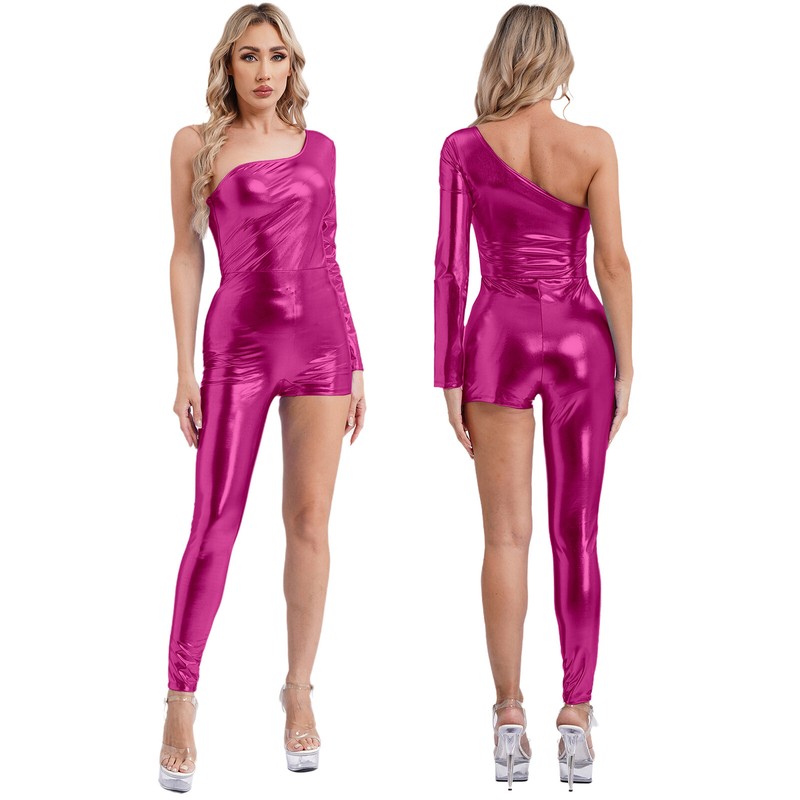 Stylish asymmetric design: one shoulder, one long sleeve and one long pant, makes you sexy and charming. Side zipper closure is easy to wear.