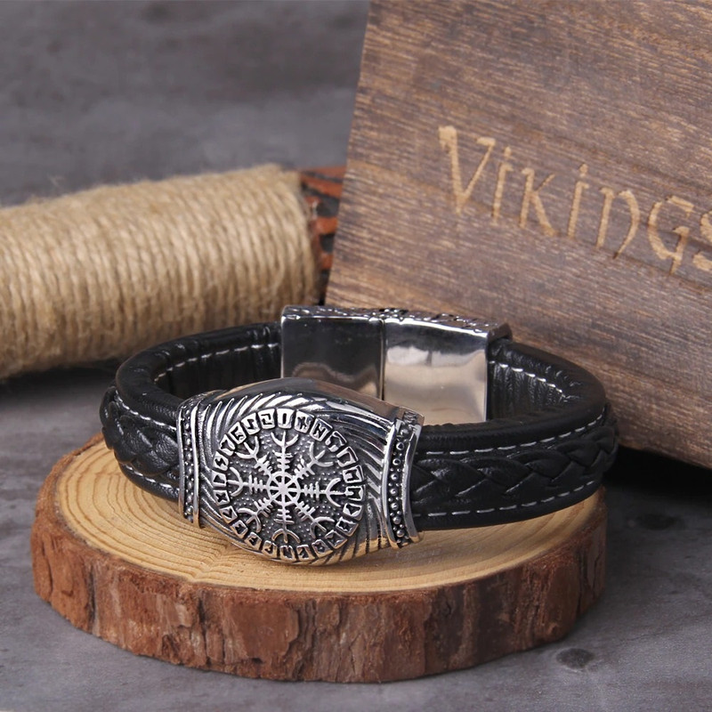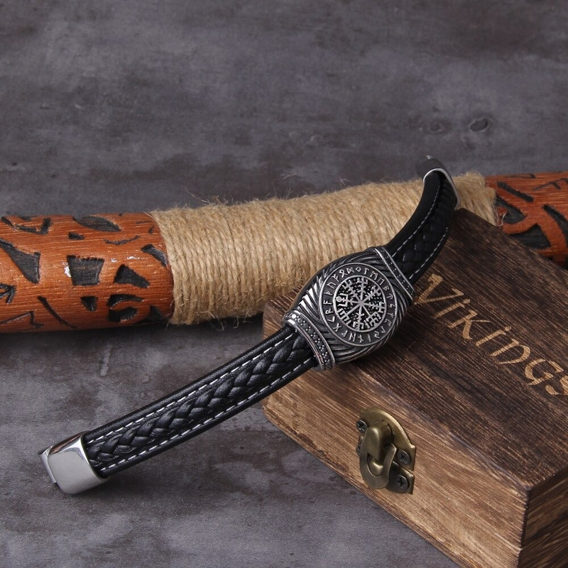 316L Stainless Steel Viking Vegvisir Compass Pendants Bangle Nose Runes Men Jewelry Odin Symbol Leather Bracelet Gift For Boyfriend With Viking Wooden Box