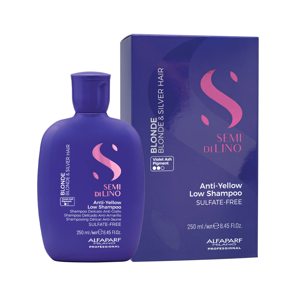 Le Shampooing Anti-Yellow Low Shampoo nettoie délicatement, neutralise les reflets jaunes indésirables, donne force et hydratation aux cheveux.
