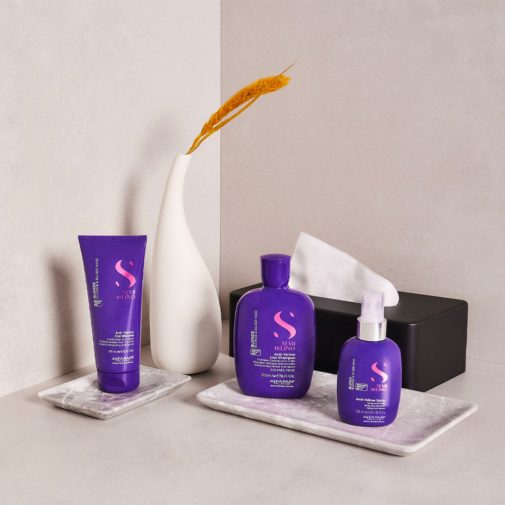 Routine beauté recommandée pour les cheveux blonds et argentés :Anti-Yellow Low Shampoo, Anti-Yellow Conditioner, Anti-Yellow Spray.