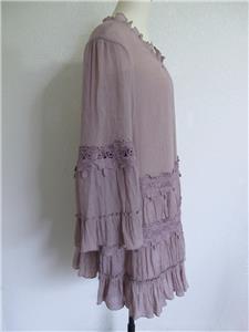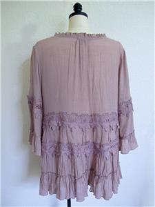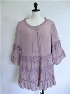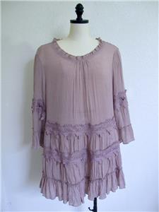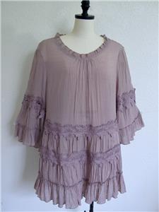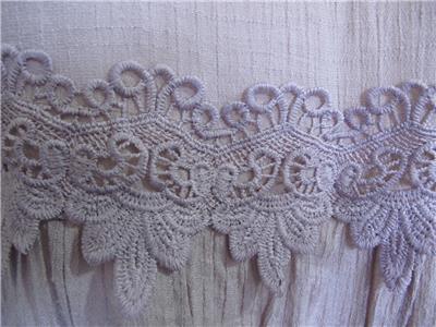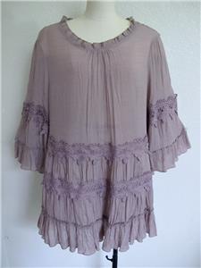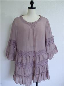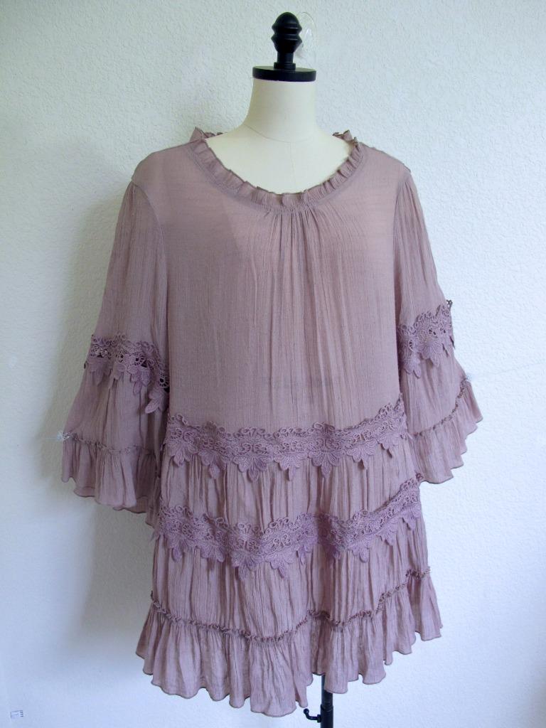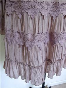 Loose an flowy through the torso, with tiers of ruffles and crochet lace.