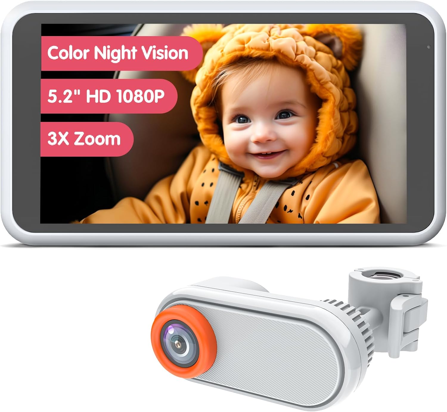 Baby Car Camera 5.2" 1080P Color Night Vision Monitor 360° Rotation for Backseat