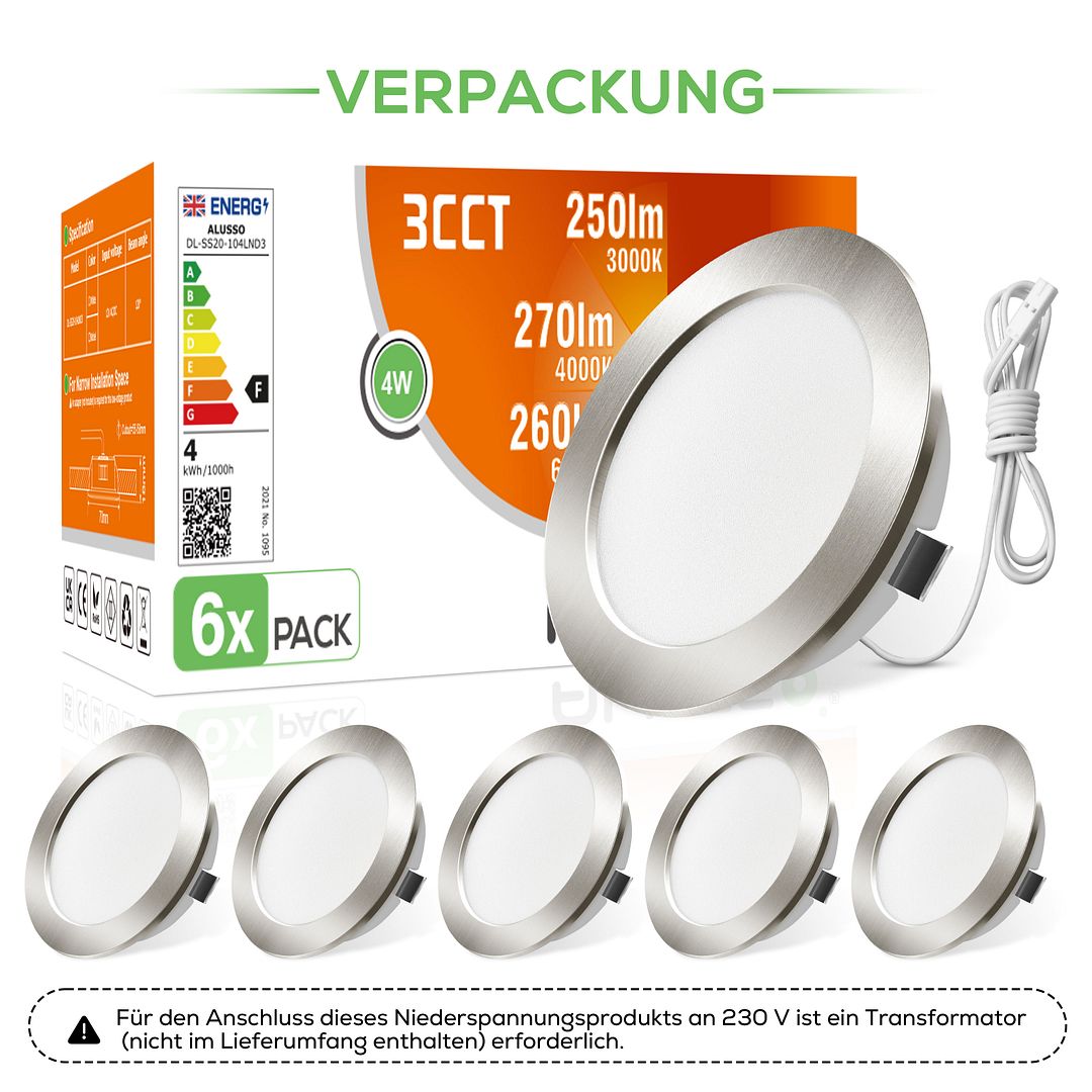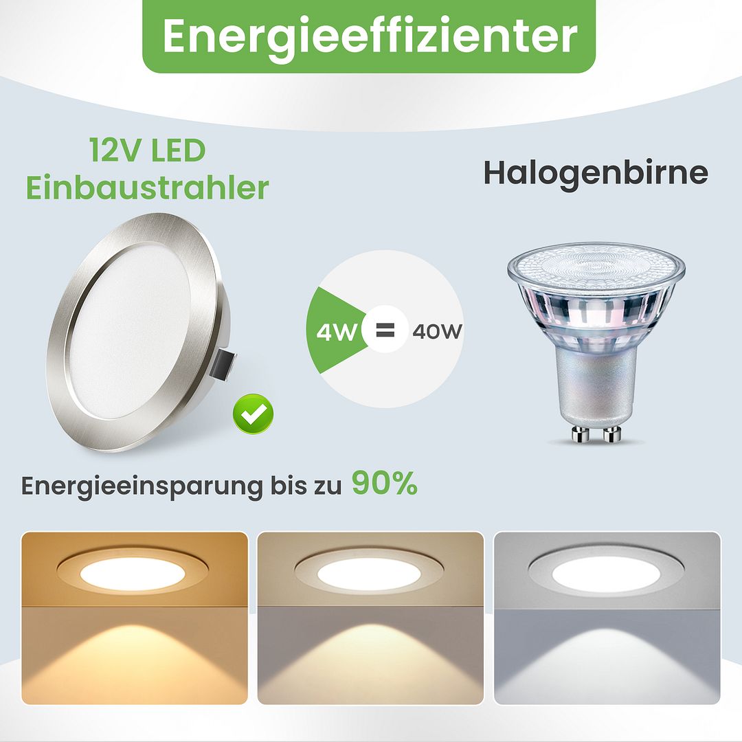 【Beste Qualität】Unser Downlight mit der neuesten Technologie SMD LED hat eine hohe Energieeffizienz und niedrigeren Verbrauch, spart bis zu 90% im Vergleich zu Halogenlampen. 12V AC/DC sind alle verfügbar oder können über einen Transformator (nicht im Lieferumfang enthalten) an eine 230V Versorgung angeschlossen werden.