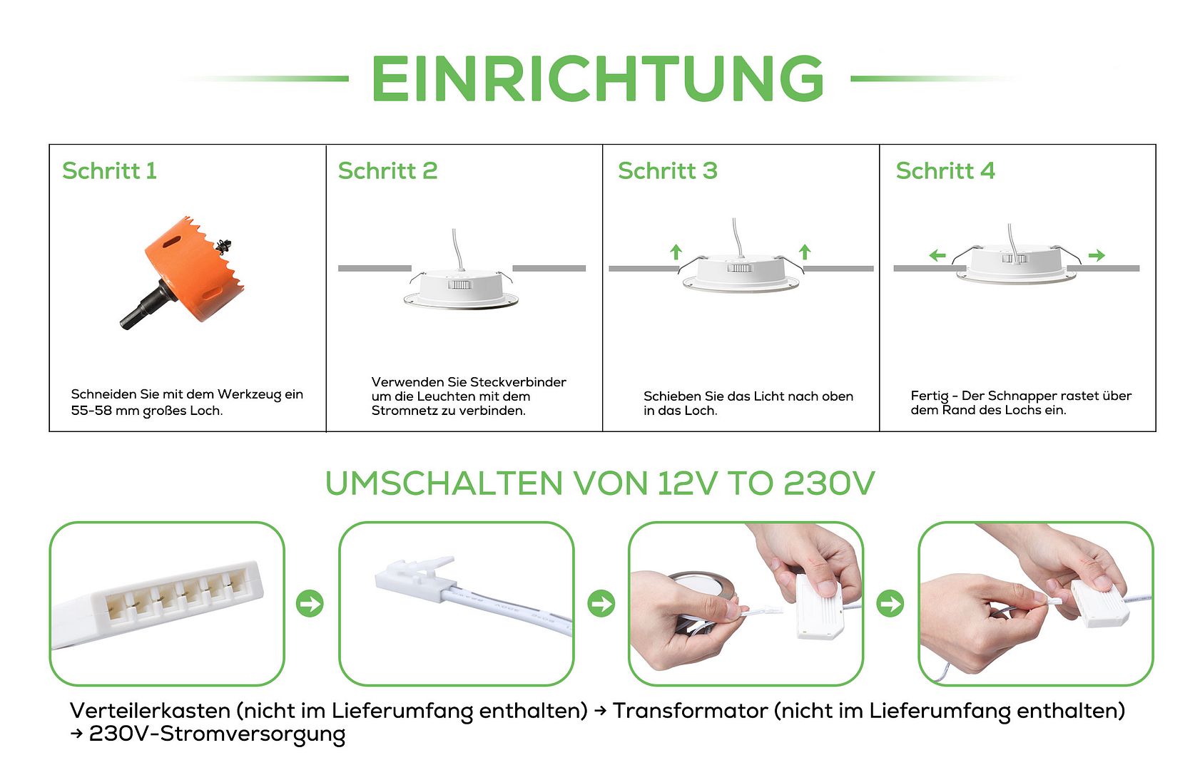 🔔ANMERKUNG: Für den Anschluss an eine 230V-Stromversorgung benötigen 6 Leuchten einen Transformator von mindestens 30W.