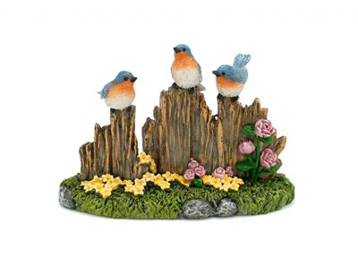 Miniature Fairy Garden Blue Birds Chatting on Flowered Fence