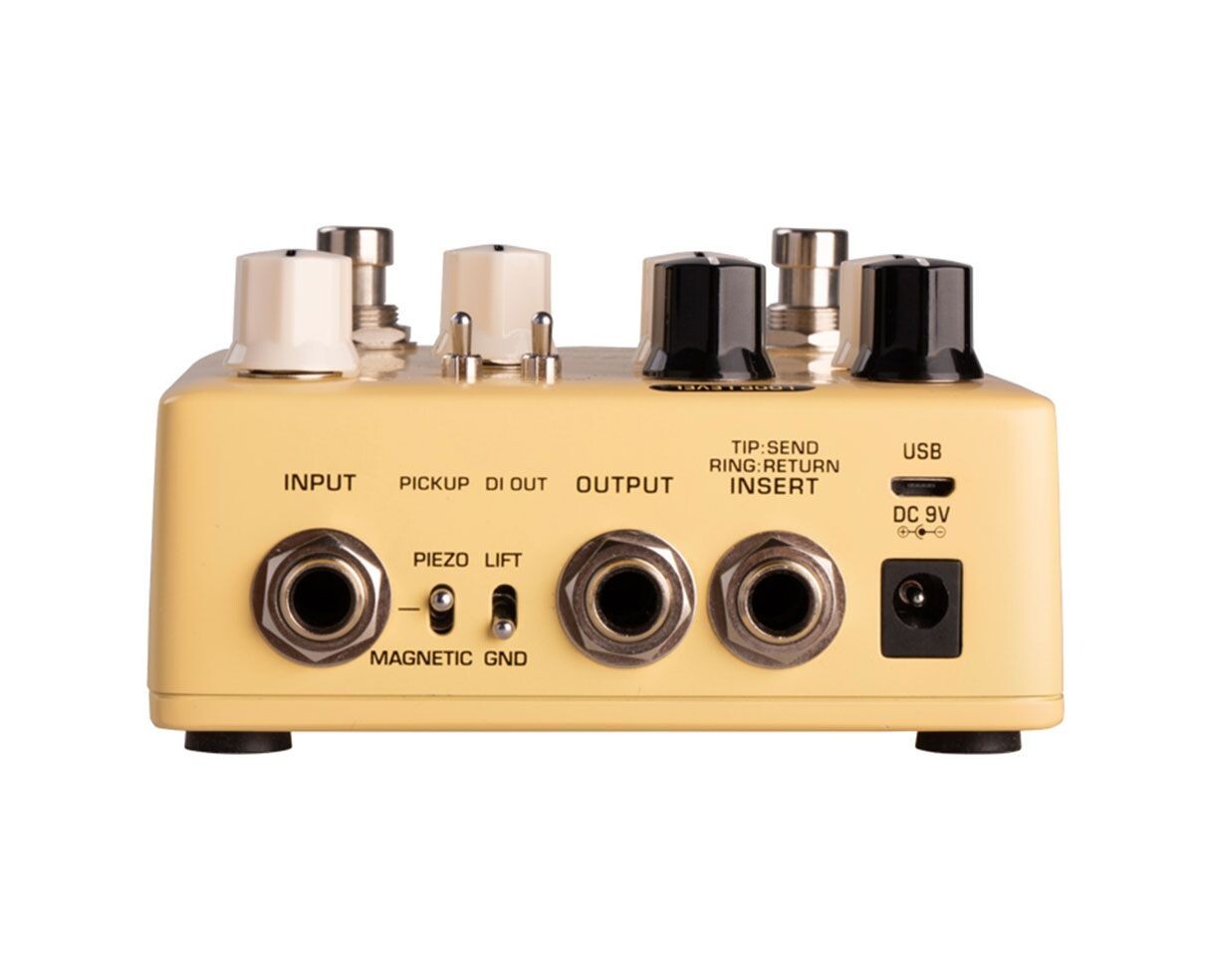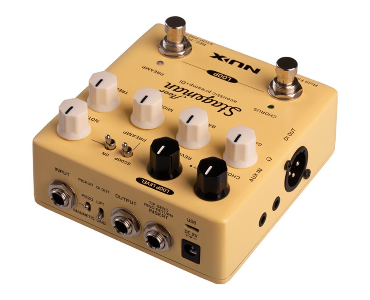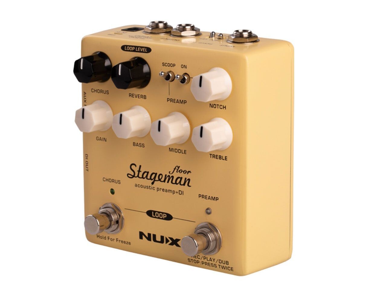 NUX Stageman Floor is an analog acoustic preamp with digital effects and looper function. It's a preamp, featuring a highly sensitive 3-band EQ with MID scoop toggle switch, an adjustable notch filter, and input gain control, provides ginormous headroom and delivers the sound all natural.