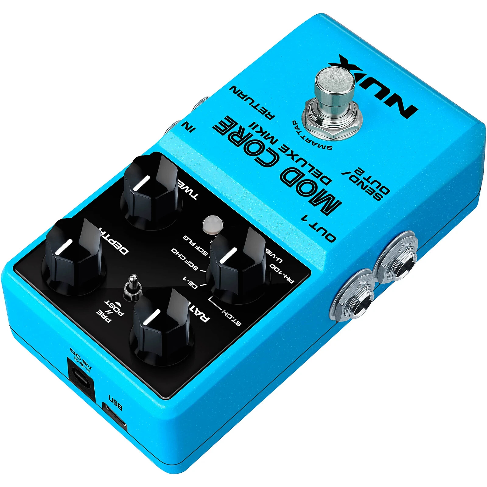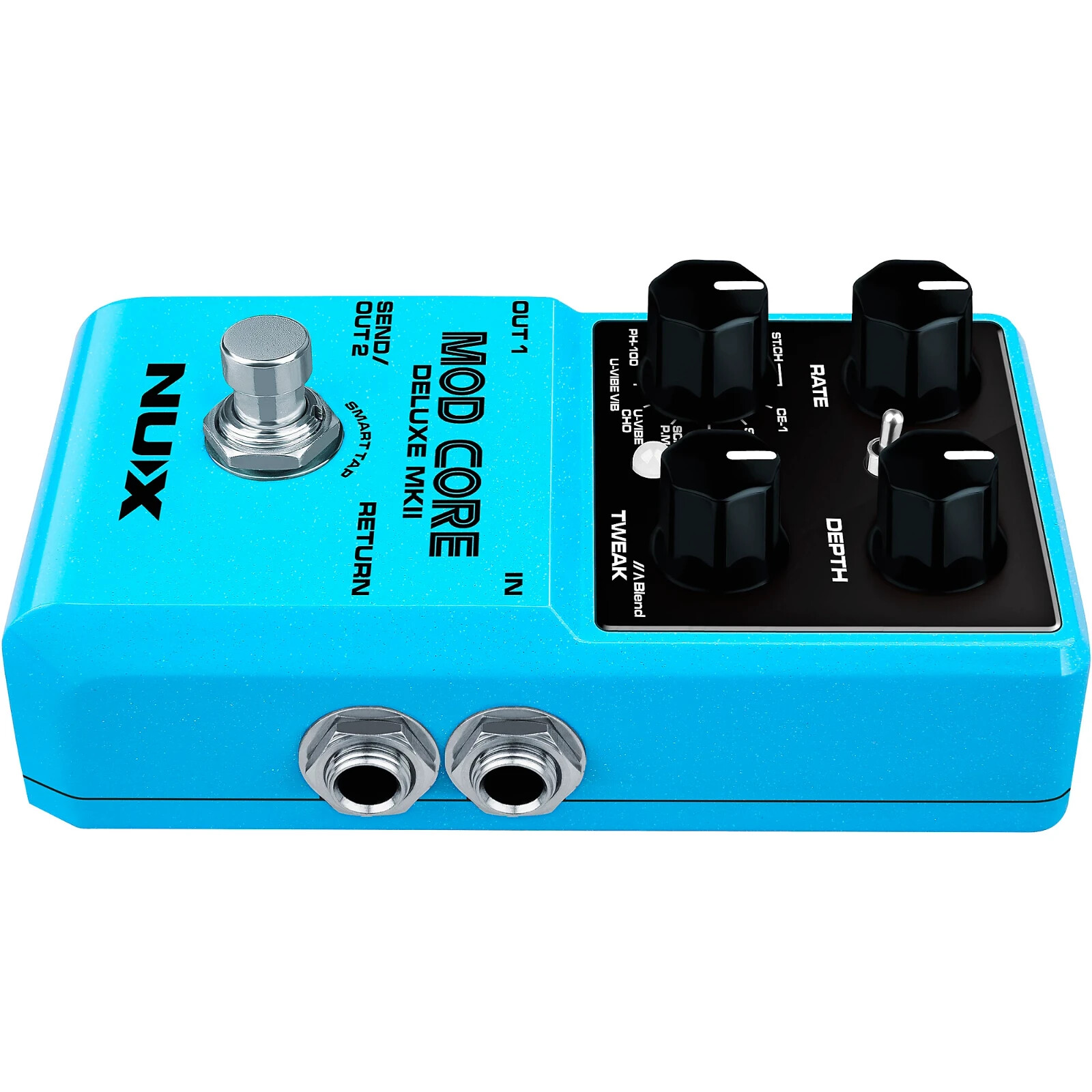 The NUX MOD CORE DELUXE MKII is a modulation pedal with 8 different types including ST.CH (Stereo Chorus), CE-1, SCF CHO, SCF FLG, SCF P.M., U-VIBE CHO, U-VIBE VIB and PH-100. You can switch the mod types by way of the Type rotary switch.