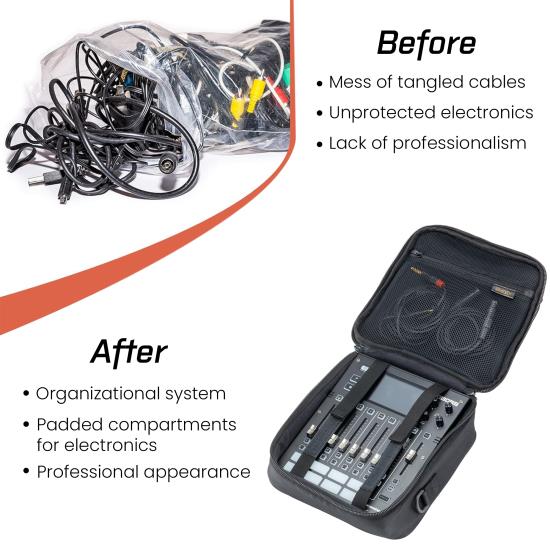 With thoughtful design features to keep your gear safe and organized, the mixer bag offers internal touch-connect tie-down straps to secure your mixer and a plush tricot interior that prevents scratches. Additional storage options include an external pocket with cable-management straps to keep your cables tangle-free and an internal zippered pocket for accessories like headphones and small LED lights. Whether you're heading to a gig or a recording session, this versatile bag ensures your equipment remains secure and easily accessible.