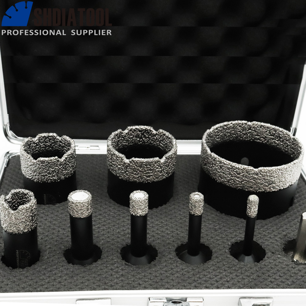 Item: One set Vacuum brazed diamond core bits with Box, professional quality Quantity: 9pcs products with box (Diameter 6mm 8mm 10mm 13mm 19mm 35mm 45mm 65mm Drill Bit; 5/8-11 male thread To 3/8" Hexagon Shank Adapter. each size one piece) Specificiation: Drill Bit: Diameter 6mm 8mm 10mm 13mm 19mm 35mm 45mm 65mm, Total length: 75mm, Connection: 5/8-11 Thread, Diamond height 10MM; Adapter: 5/8-11 male thread, 3/8" Hexagon Shank, total length 55MM, shank length 28MM Box Size: 22x15x8CM Application: 1. Drill Bit: Dry/wet drilling for porcelain tile, granite, marble, ceramic; 2. Aapter: 5/8-11 thread core bits can be fitted on hand drill or electric drill. Feature: 1. Vacuum brazed technology provide high efficient working performance 2. Fast and Smooth drilling 3. Long lifetime 4. Less Chipping 5. Minimizing any breakage 6. Less loss of material 7. Less heat generation 8. Better finish quality 9. Adapter: Good quality steel, long life, and Surface Nickel plating ================THE END================ Note: These products are marked with our brand. If you do not want our brand name, please leave us message, we could send you products without brand. Customize service: we could mark your brand name on our products