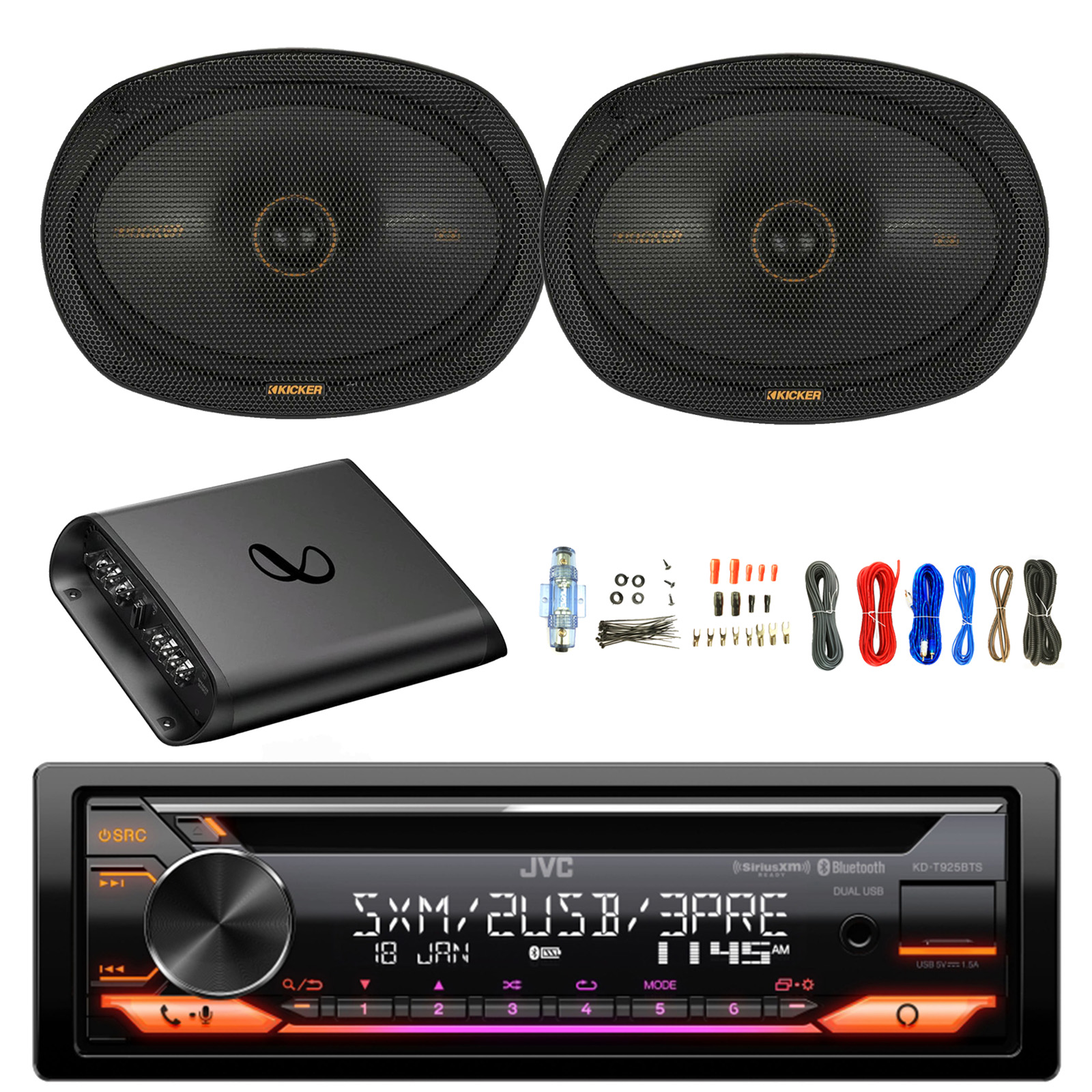 PACKAGE BUNDLE INCLUDES: JVC KD-T925BTS Single DIN USB AUX Bluetooth AM/FM Radio CD Player Stereo Receiver, 2x 6x9" 300 Watt Max 2-Way Thin-Mount Car Audio Speakers, 2-Channel Amplifier with Wiring Install Kit