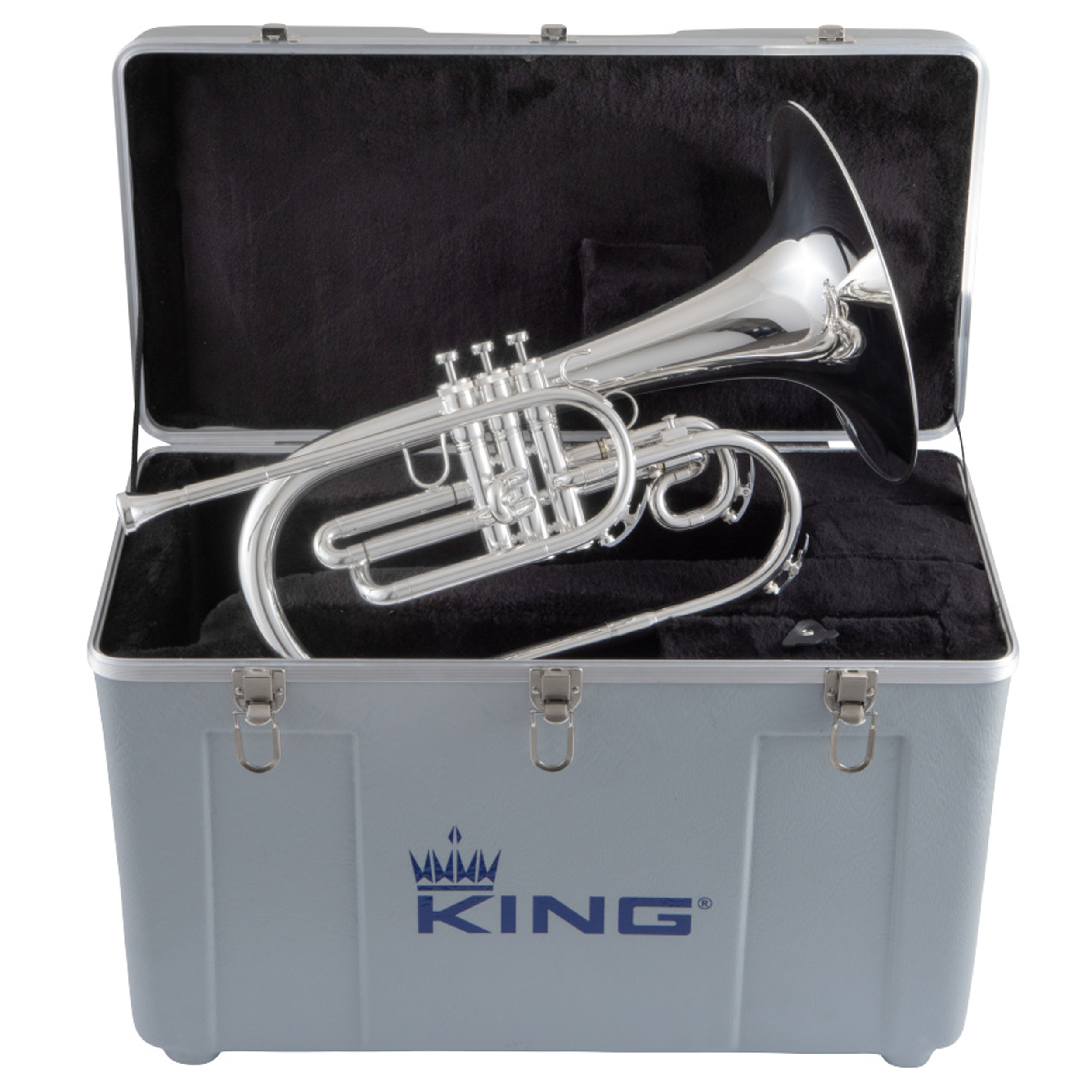 The King "Ultimate" KMP611 mellophone is a highly responsive instrument that provides a powerful solo alto voice. Equally proficient in section work, it produces a full, rich sound that blends extremely well. The all-new mouthpipe and bell designs increase projection and power of the KMP611's sound and the 1st slide thumb saddle and 3rd slide finger ring allow for easy intonation adjustments. Monel pistons provide smooth, quick action and unmatched durability.