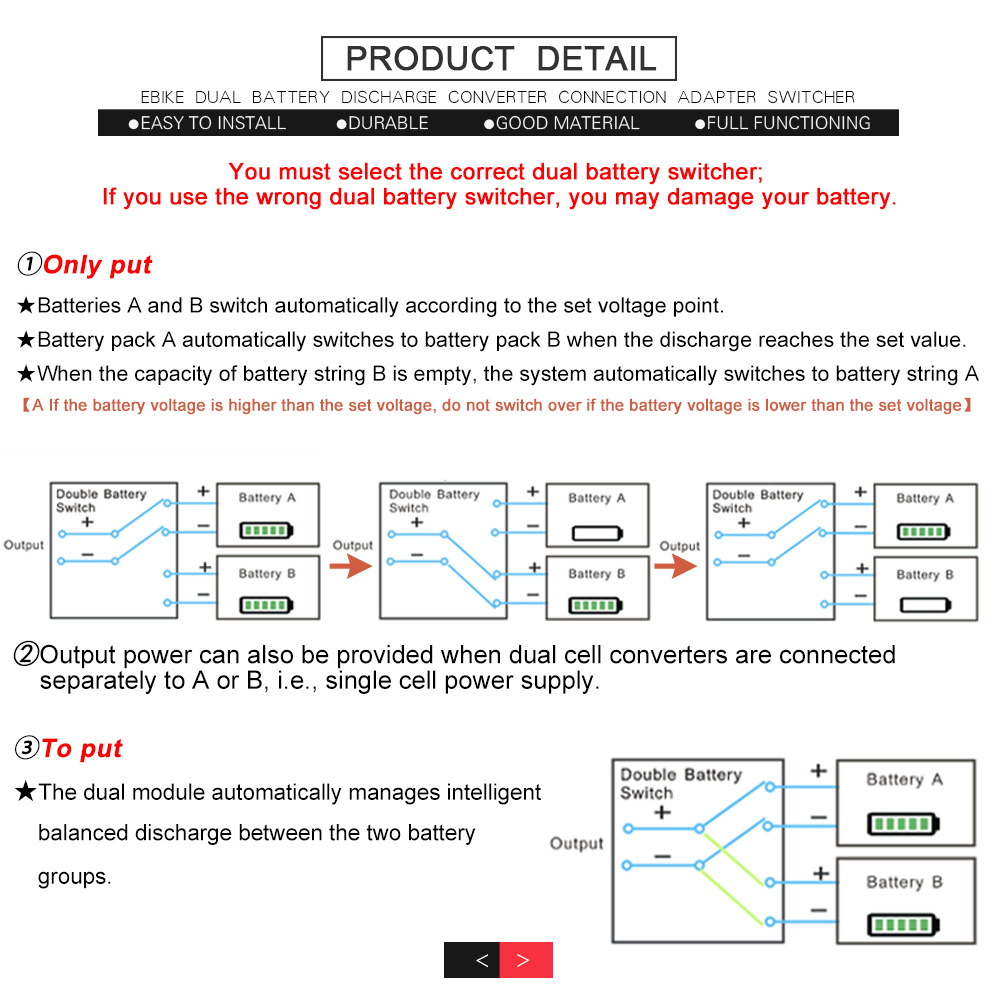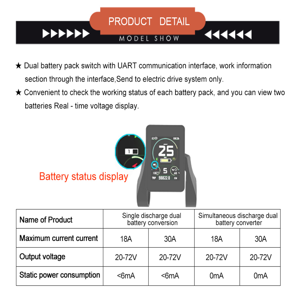 4.The Dual batteries connected in parallel for additional capacity and range, and the switcher can manage the two batteries on your bike. It will detect the voltage of the two batteries in real time. When battery is exhausted during riding, it will automatically switch from battery to the other, again for you Powered by the electric bicycle, or support two batteries to simultaneously supply power to your electric bicycle intelligently and balancedly.