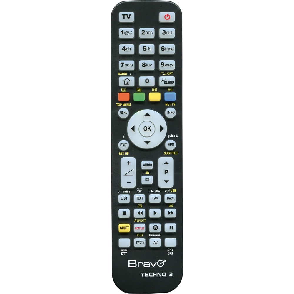Telecomando a tre banchi di memoria programmabile con facilità. Sostituisce le principali funzioni degli apparecchi TV, VCR, DVD, SAT, DTT o SKY. Programmabile tramite PC con cavo IR con il catalogo BRAVO il cui database viene aggiornato mensilmente con i nuovi telecomandi presenti sul mercato. Copre tutti i modelli presenti sul catalogo BRAVO. Per la programmazione è necessario il cavo e il catalogo forniti nel KIT BRAVO che non è incluso.