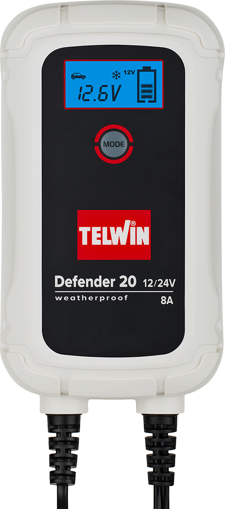 CARGADOR DE BATERÍAS TELWIN DEFENDER 20Marca: TELWIN SKU: 53443 - EAN: 8056151817402 Cargadores y mantenedores de baterías defender 20 con control electrónico de la corriente de carga, interrupción y restablecimiento automático (PULSE TRONIC) para baterías plomo-ácido de 12/24V del tipo WET, GEL, AGM MF EFB reconocimiento automático de la tensión de la batería 12/24V, señal de carga LED, fin de carga 230V - 50/60Hz - W 100 - tensión V 12/24 - corriente de carga y convencional 8/4 A-capacidad? nominal A 5 - dimensiones (AnxPrxAl) mm.30x9,5x5,5 - peso kg.1,2
