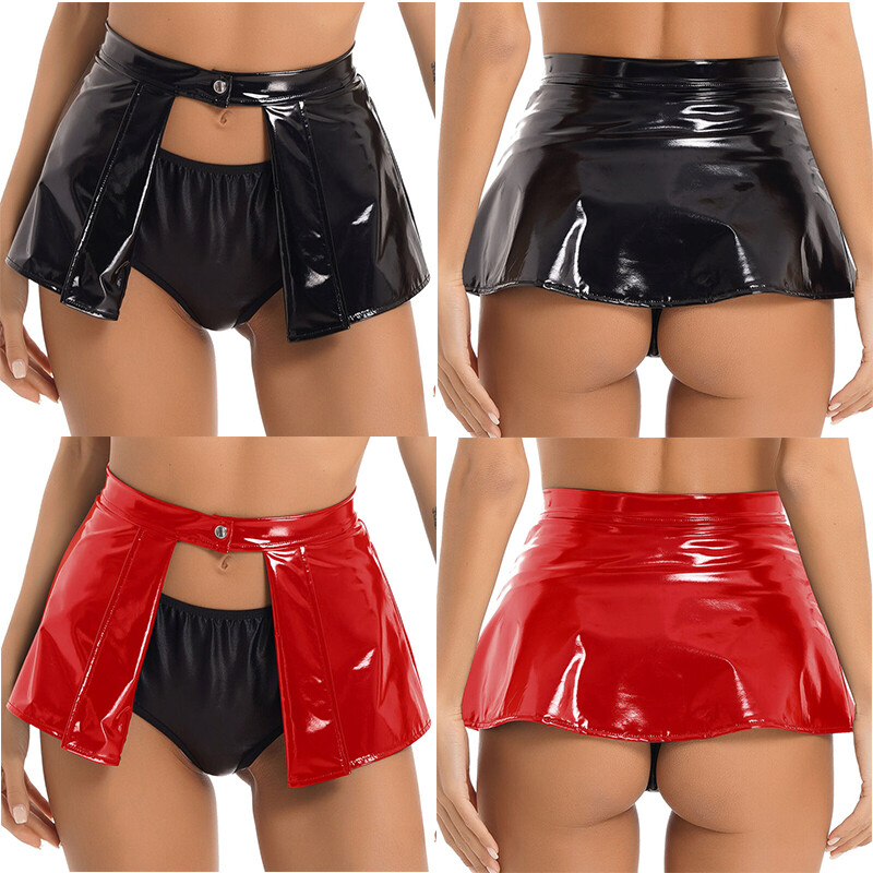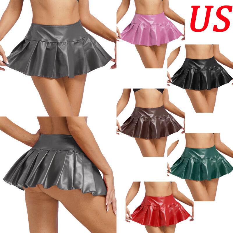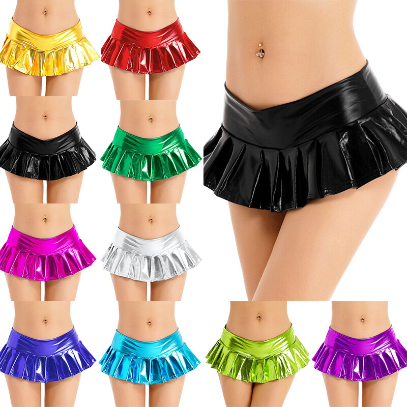 Glossy appearance, solid color, high waist mini skirt with elastic waistband for comfy fit.