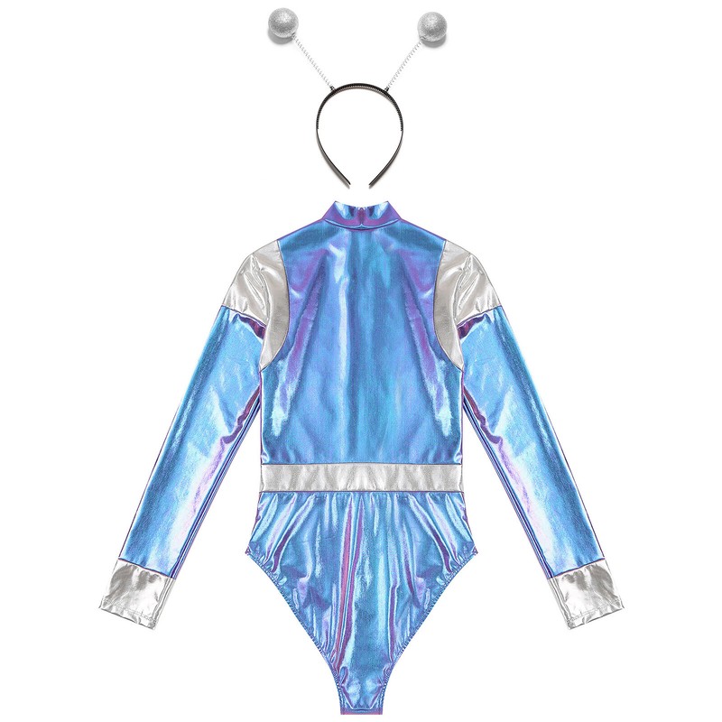 Astronaut Kostüm Damen Metallic Bodysuit mit Alien Haarreif Halloween Karneval