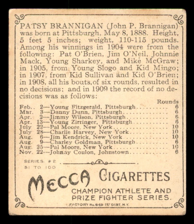 1910 T218 Champions Boxing #6 Patsy Brannigan (Boxer) VG