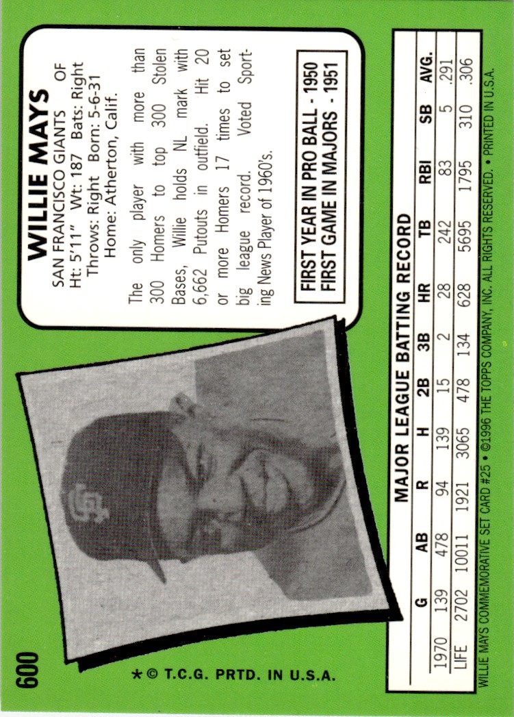 | Description: | Willie Mays | | Category: | Baseball | | Year: | 1997 | | Product: | Topps Commemorative Reprints | | Team: | San Francisco Giants | | Card Number: | 25 | | Dimensions: | 3½" x 2½" | | SKU: | BL B0002 R03 G (25) |