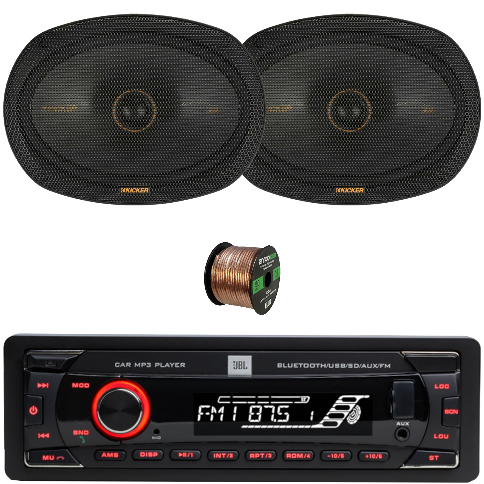 PACKAGE BUNDLE INCLUDED: JBL Celebrity100 Single DIN Bluetooth FM Radio USB/AUX SD/MP3 Cars High Power Mechless Stereo Receiver, 2x Kicker KS-Series KSC690 6x9" 300 Watt Peak Power 2-Way Thin-Mount Car Audio Speakers W/1" Tweeters, 50 Feet 16 Gauge Speaker Wire