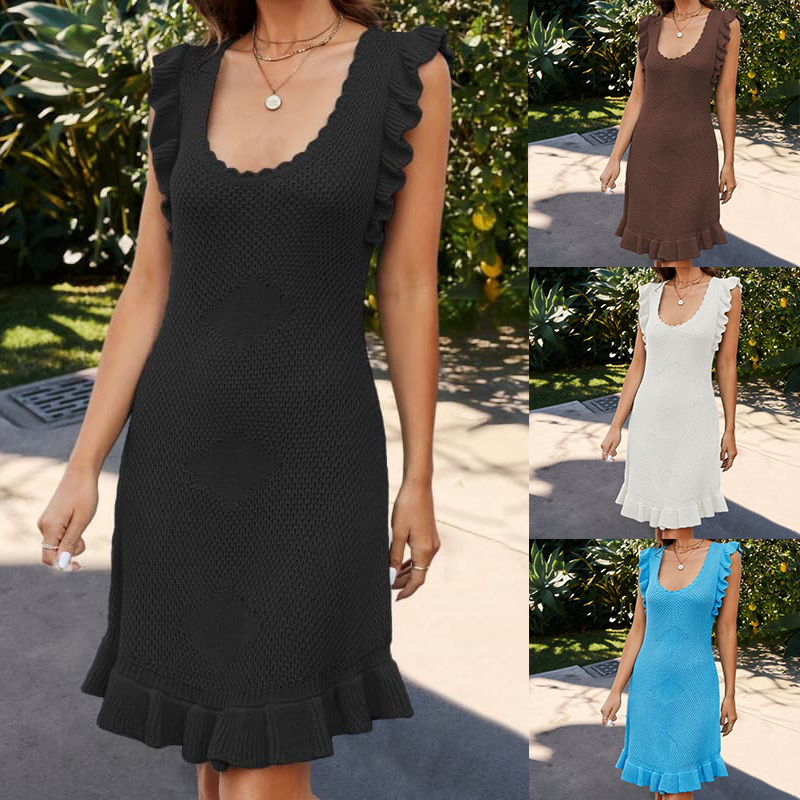 Women Knitwear Dress Solid Color Mid-Length Stringy Selvedge Dress Round Neck